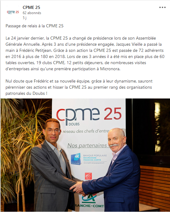 Frédéric PETITJEAN a été élu Président de la CPME 25, le 15/02/2019